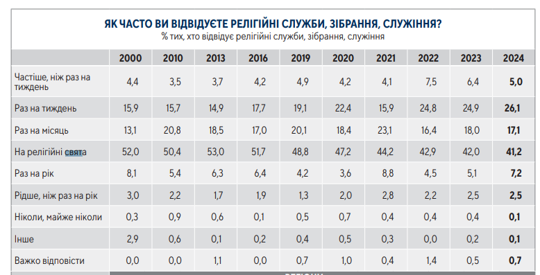 Доля членов религиозных общин, которые отнесли себя к ПЦУ, среди всех опрошенных по сравнению с 2021 годом выросла с 6% до 11%, членов греко-католических общин осталась почти неизменной (соответственно 6% и 7%), так же как и доля членов УПЦ (МП) (4% в 2021 году и 3% в 2024 году).