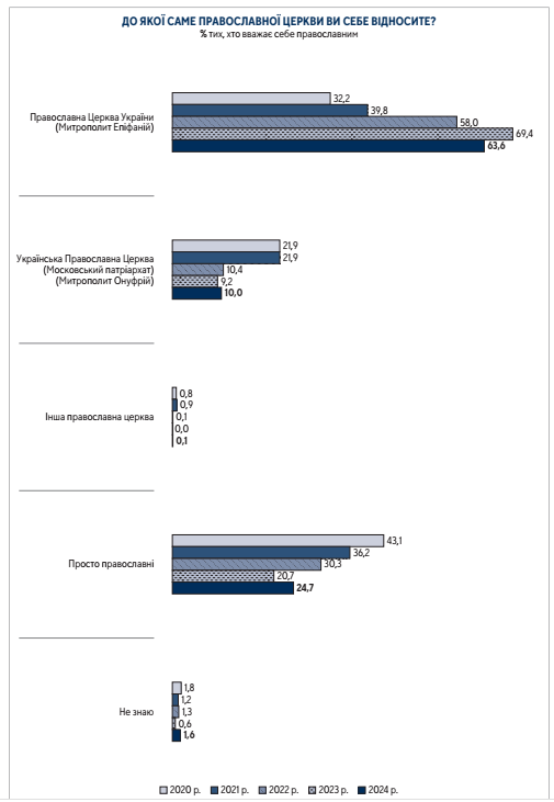 Как отмечают социологи, в 2023 году по сравнению с 2020 годом существенно (с 20% до 42% среди взрослого населения) выросло число верных Православной церкви Украины, преимущественно за счет уменьшения "просто православных".