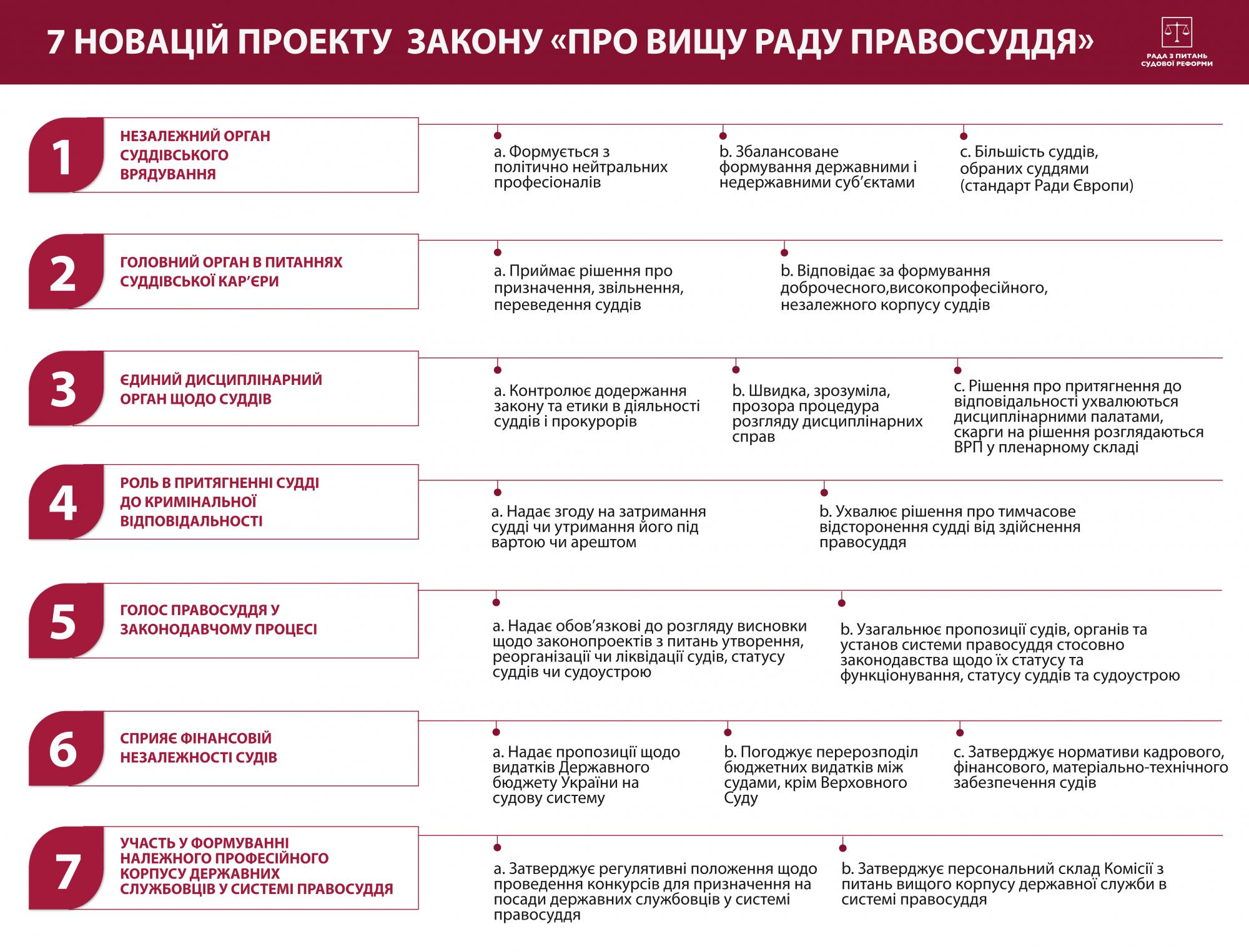 "Утворення Вищої ради правосуддя впорядковує систему органів правосуддя, усуває дублювання повноважень і створює ефективний, прозорий і аполітичний механізм прийняття рішень про суддівській кар'єрі", - йдеться в повідомленні.