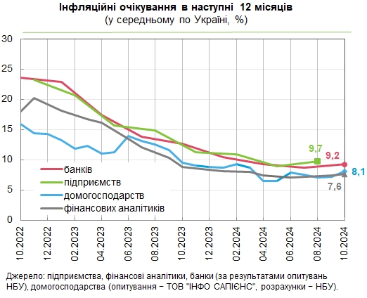 Украинские банкиры в октябре ожидают инфляцию через 12 месяцев на уровне 9,2. Это выше предыдущего прогноза за июль на уровне 8,7%.