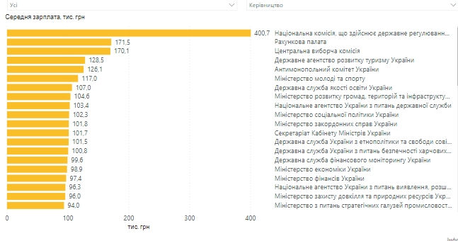 По данным Минфина, лидирует по уровню зарплат Национальная комиссия, осуществляющая государственное регулирование в сферах энергетики и коммунальных услуг (НКРЭКУ). В среднем ее работники получают зарплату в 68,9 тысячи гривен. В комиссии работает 531 человек. Зарплата ее руководства также самая большая - 400,7 тысяч гривен.