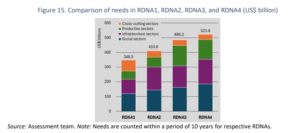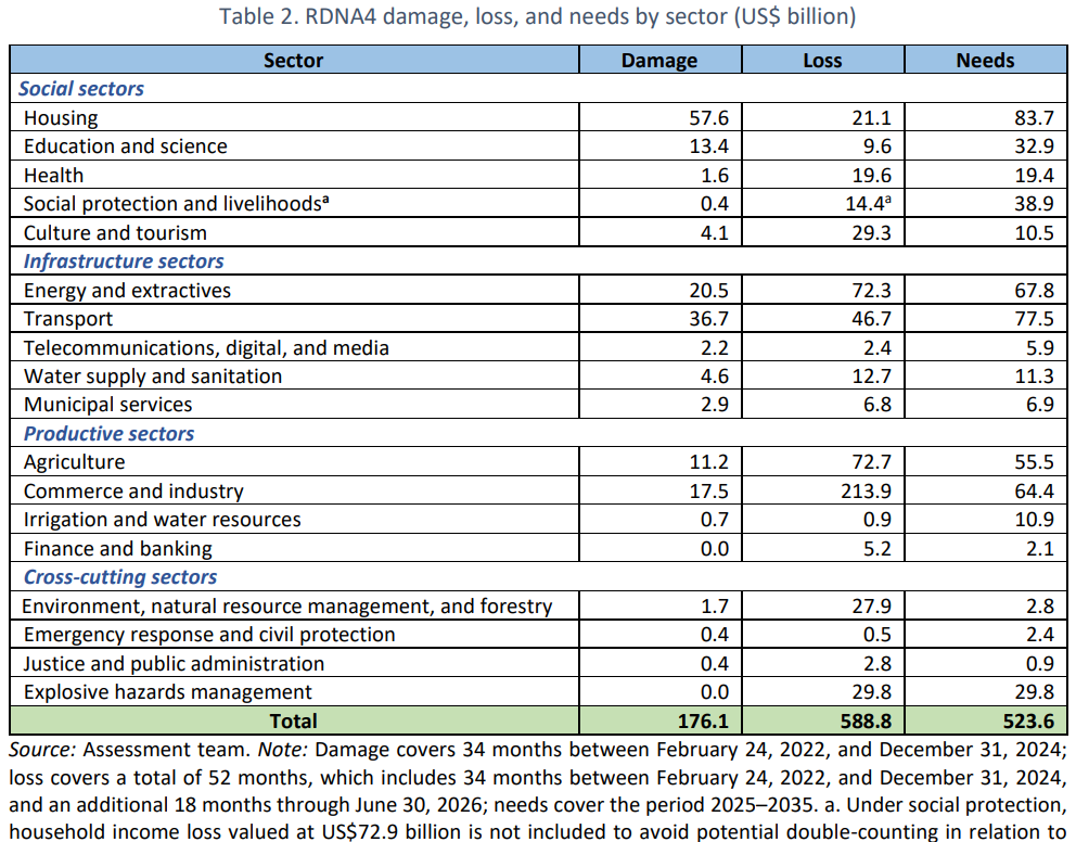 Наибольшие потребности оцениваются в жилищном секторе (почти 84 млрд долларов, или 16% от общей суммы). Далее следуют транспорт (почти 78 млрд долларов, или 15%), энергетика и добывающая промышленность (почти 68 млрд долларов, или 13%), торговля и промышленность (более 64 млрд долларов, или 12%), сельское хозяйство (более 55 млрд долларов, или 11%), социальная защита и средства к существованию (39 млрд долларов, или 7%) и управление взрывоопасными предметами (почти 30 млрд долларов, или 6%).