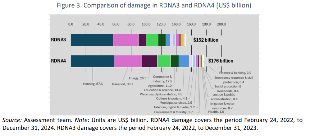 Прямой ущерб Украине от российского вторжения в настоящее время достиг 176 млрд долларов, что больше, чем 152 млрд долларов в оценке от февраля 2024 года, при этом наиболее пострадавшими секторами являются жилье, транспорт, энергетика, торговля и промышленность, а также образование.