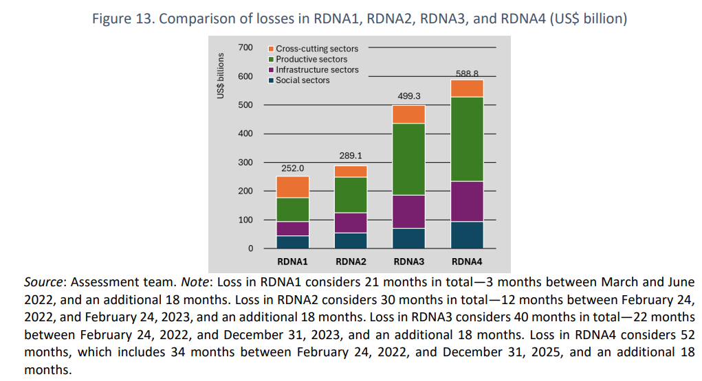 При этом нарушения экономических потоков и производства, а также дополнительные затраты, связанные с войной, в совокупности оцениваются как экономические потери и составляют 588,8 млрд долларов. Год назад оценка была на уровне 499,3 млрд долларов.