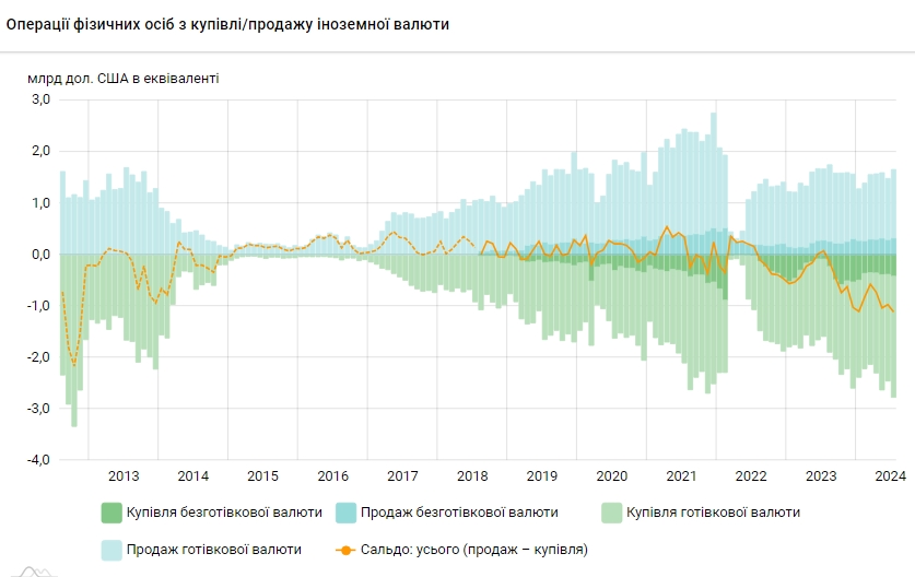 Население Украины в июле 2024 года продало коммерческим банкам наличной и безналичной валюты на 1,658 млрд долларов (в эквиваленте) и купило на 2,775 млрд долларов. Чистая покупка валюты составила 1,117 млрд долларов.