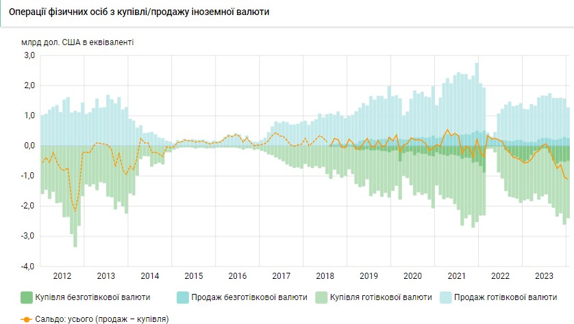 Население Украины в январе 2024 года продало коммерческим банкам наличной и безналичной валюты на 1,282 млрд долларов (в эквиваленте) и купило на 2,386 млрд долларов. Чистая покупка валюты составила 1,103 млрд долларов.