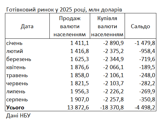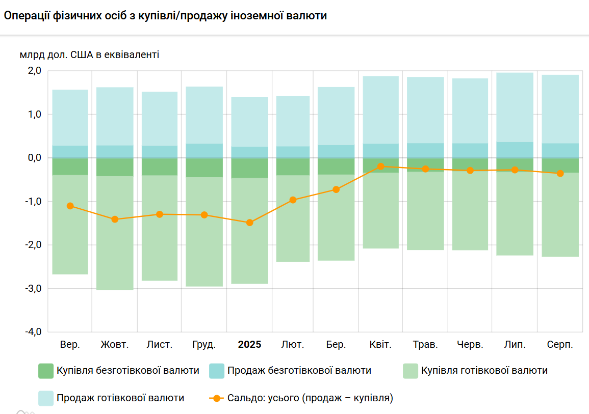 Население Украины в августе 2025 года продало коммерческим банкам наличной и безналичной валюты на 1,907 млрд долларов (в эквиваленте) и купило на 2,258 млрд долларов. Чистая покупка валюты составила 351 млн долларов.