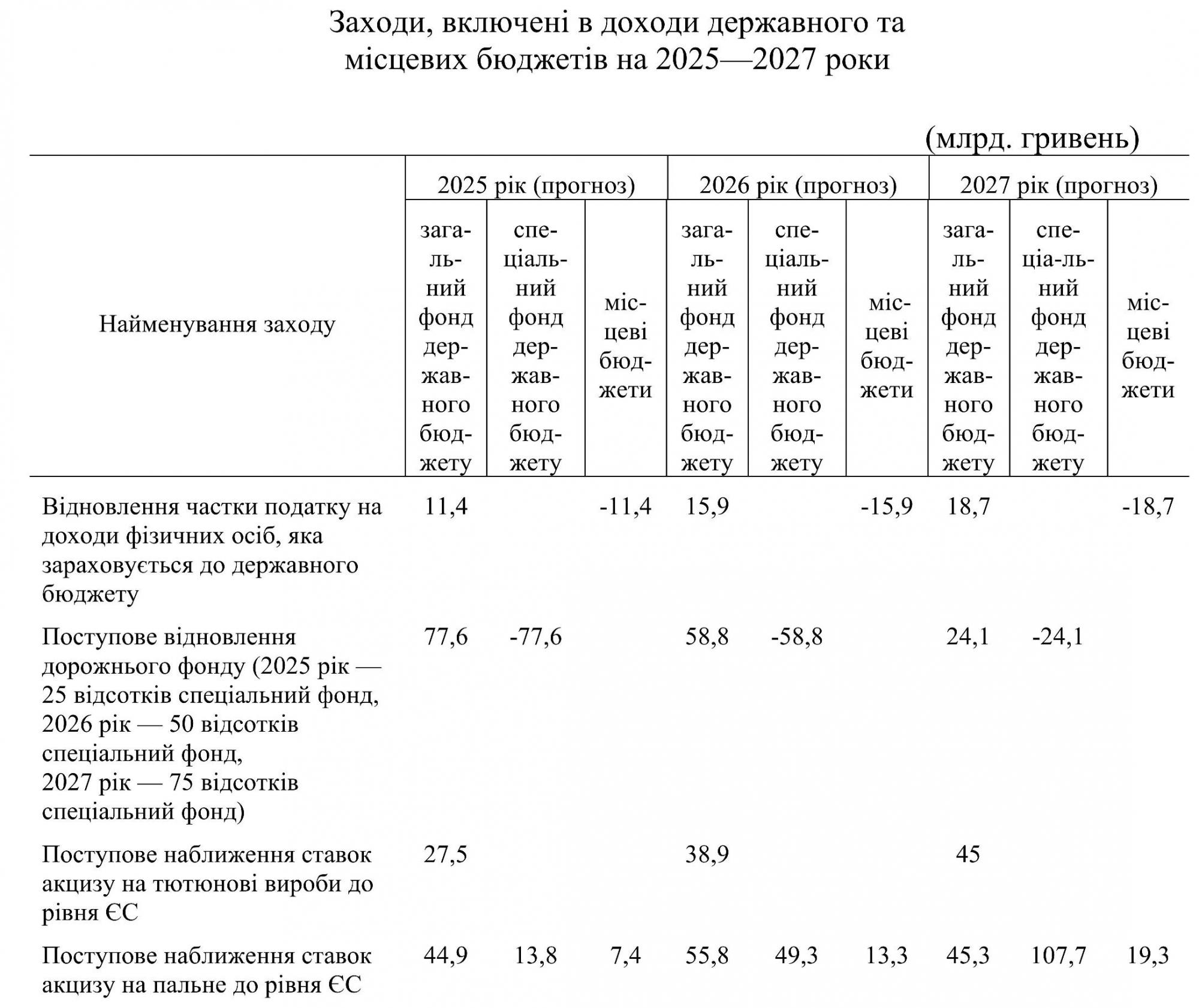 "В то же время для стабильного и непрерывного финансирования первоочередных потребностей в сфере безопасности и обороны государства от вооруженной агрессии необходима разработка дополнительного пакета мероприятий на 2025-2027 годы учитывая приоритетные задачи налоговой политики на соответствующие годы, которые обеспечили бы государственные финансы ресурсом в объеме 3 млрд. гривен ежегодно", - говорится в декларации.