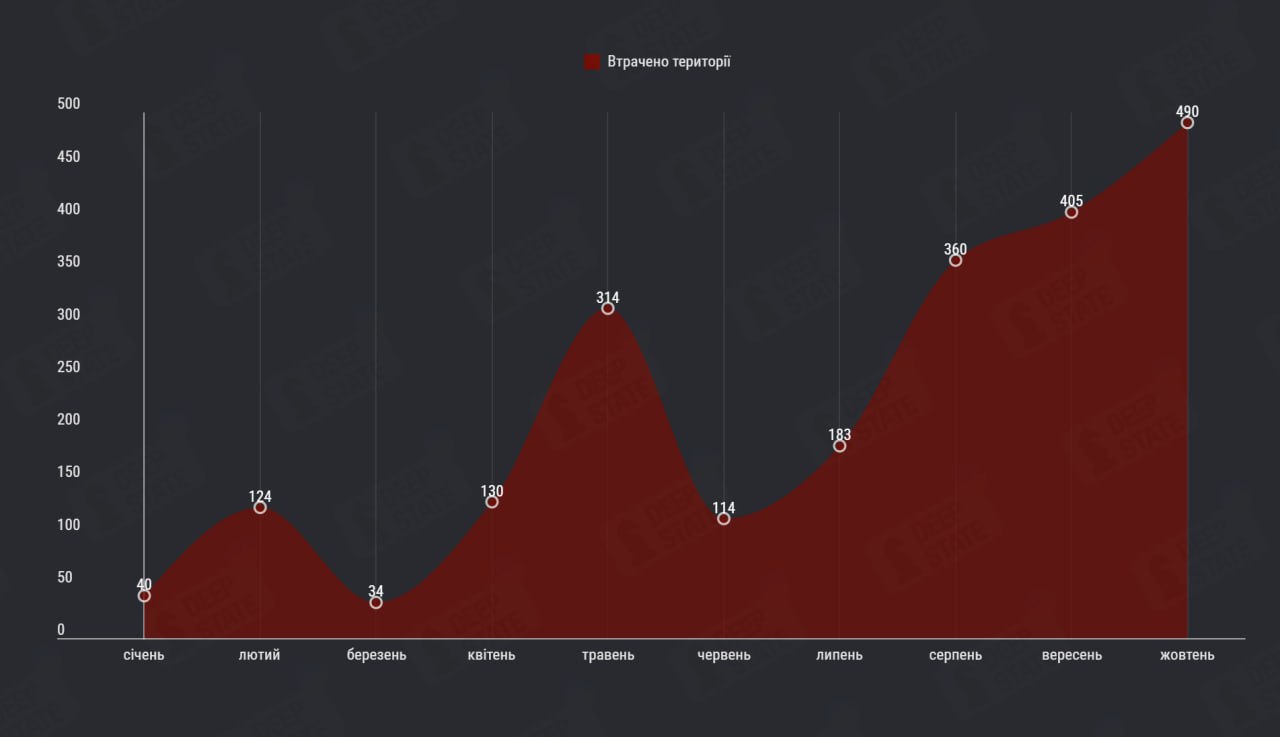 За октябрь враг оккупировал около 490 кв. км украинской территории. Это самый большой показатель за 2024 год и за время контрнаступления, которое длится с октября 2023 года.