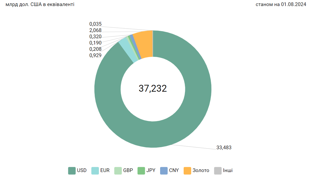 По состоянию на 1 августа 2024 года международные резервы Национального банка Украины составляли 37,232 миллиарда долларов. С начала года резервы колеблются в диапазоне 37 – 43,8 млрд долларов. Самый низкий уровень запасов был в феврале – 37,06 млрд. Самого высокого уровня ЗВР достигли в марте – почти 43,8 млрд, после чего наблюдается тренд на снижение.